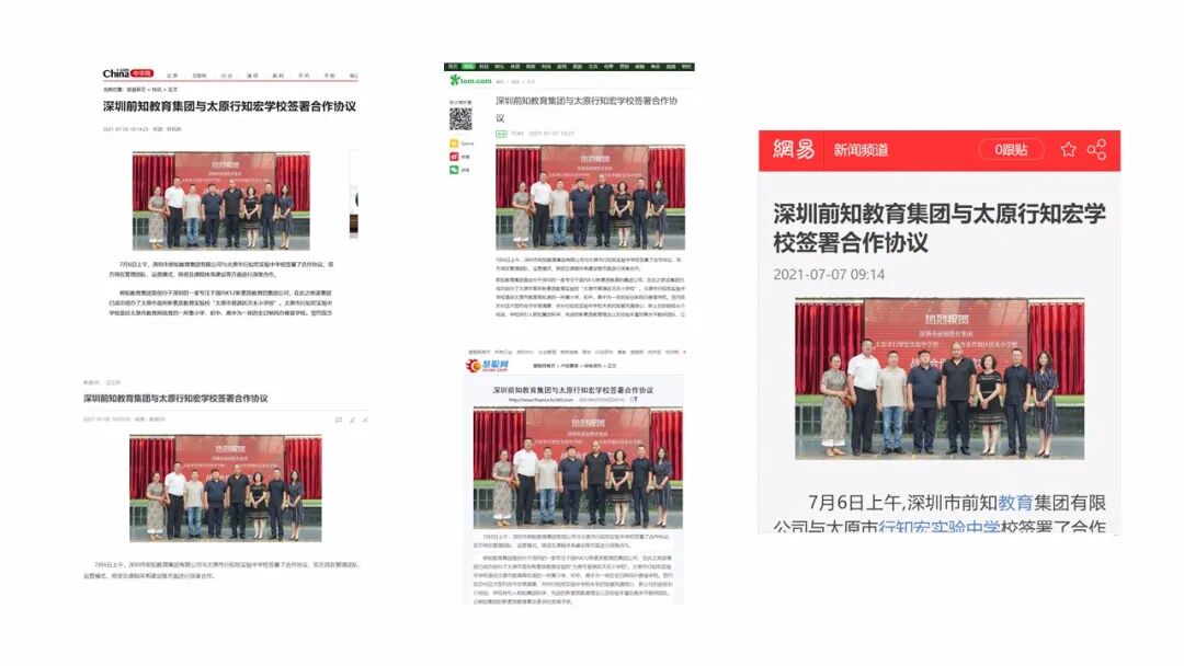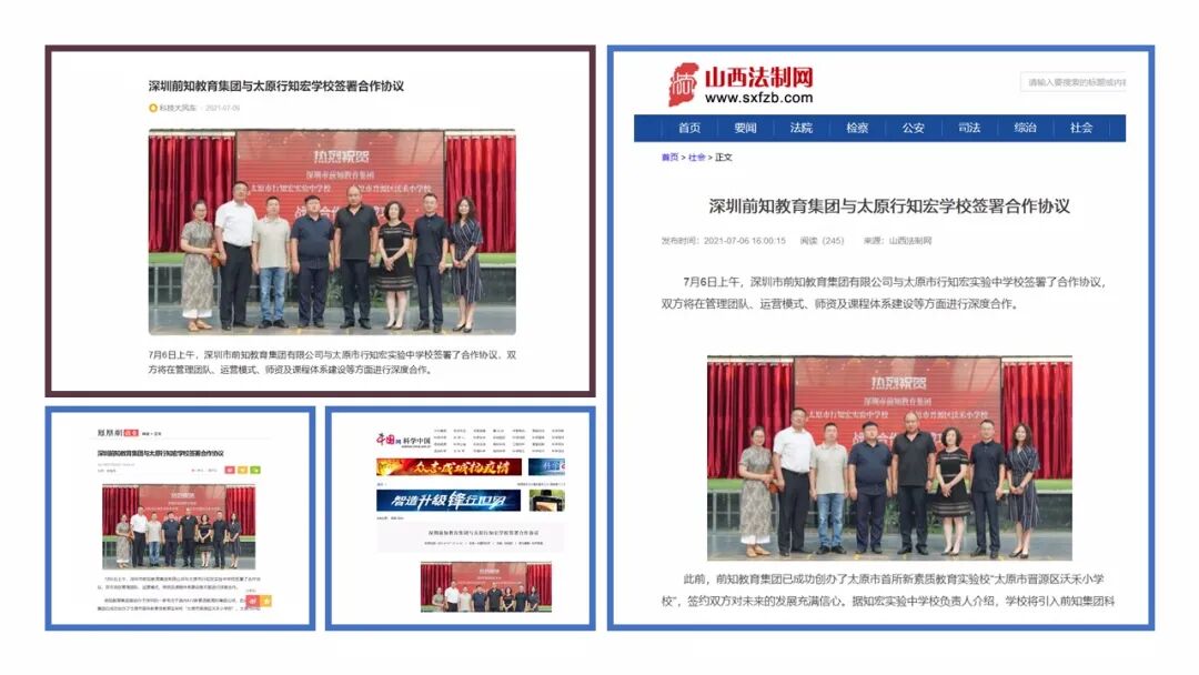 2021年7月6日上午,深圳市前知教育集团有限公司与太原市行知宏实验中学校签署了合作协议,双方将在管理团队、运营模式、师资及课程体系建设等方面进行深度合作。前知教育集团是创办于深圳的一家专注于国内K12新素质教育的集团公司,在此之前该集团已成功创办了太原市首所新素质教育实验校“太原市晋源区沃禾小学校”。太原市行知宏实验中学校是经太原市教育局批准的一所集小学、初中、高中为一体的全日制民办寄宿学校。签约双方对这次签约合作非常满意,并对行知宏实验中学校未来的发展充满信心,新上任的赵校长介绍说,学校将引入前知集团科学、先进的新素质教育理念以及经验丰富的高水平教研团队,让前知集团的新素质教育惠及更多的龙城子弟。